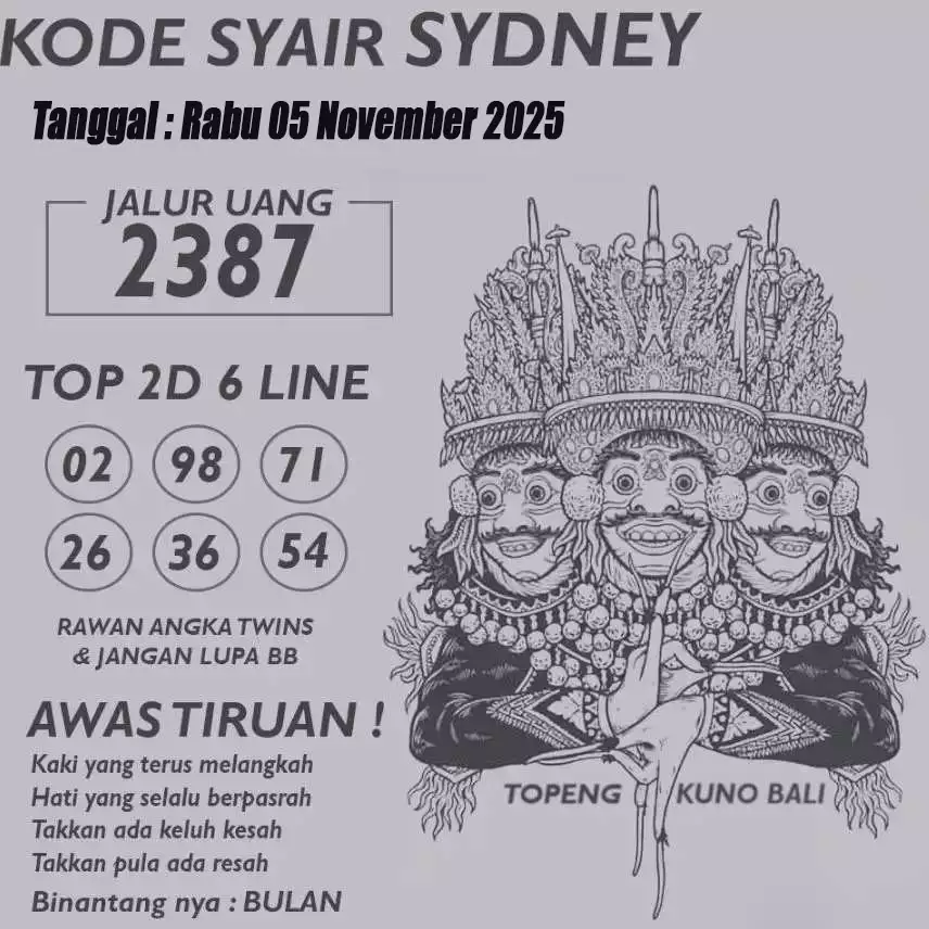 Syair togel sydney memang kerap terkait dengan angka keluaran sydney yang hendak muncul di masa nanti. Dalam Berkenaan ini beberapa baik dapat memaksudkan dan mengartikan syair togel online sdy itu akhirnya bisa memperoleh angka yang pas di masing-masing kali penempatan taruhan judi di Bandar Togel Online JOGJATOTO. Punyai beberapa keuntungan yang bagus sekali berkaitan dengan penempatan taruhan togel dengan sistem online. Dengan penempatan sama sesuai perhitungan sampai akan mendapati berkali-kali kemenangan. Silakan gunakan syair togel sdy ini untuk mendapati angka tepat untuk meraih kemenangan besar.