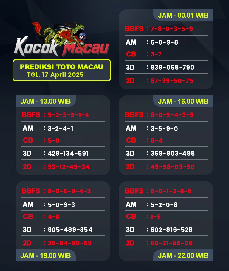 Syair togel Toto Macau adalah kode gambar yang dikeluarkan ke publik untuk menolong pemain judi togel supaya dapat semakin gampang untuk menang di menerka-nerka angka togel. Hal ini dikerjakan untuk dapat memperoleh kode syair togel karena itu pemain dapat segera membuka situs prediksi togel online yang telah disiapkan dengan fasilitas online. Situs Prediksi JOGJATOTO sendiri memiliki beberapa situs prediksi togel yang dibikin oleh beberapa master togel yang telah eksper yang mempunyai mimpi dapat menolong beberapa pencinta togel menang di beli nomor togel.