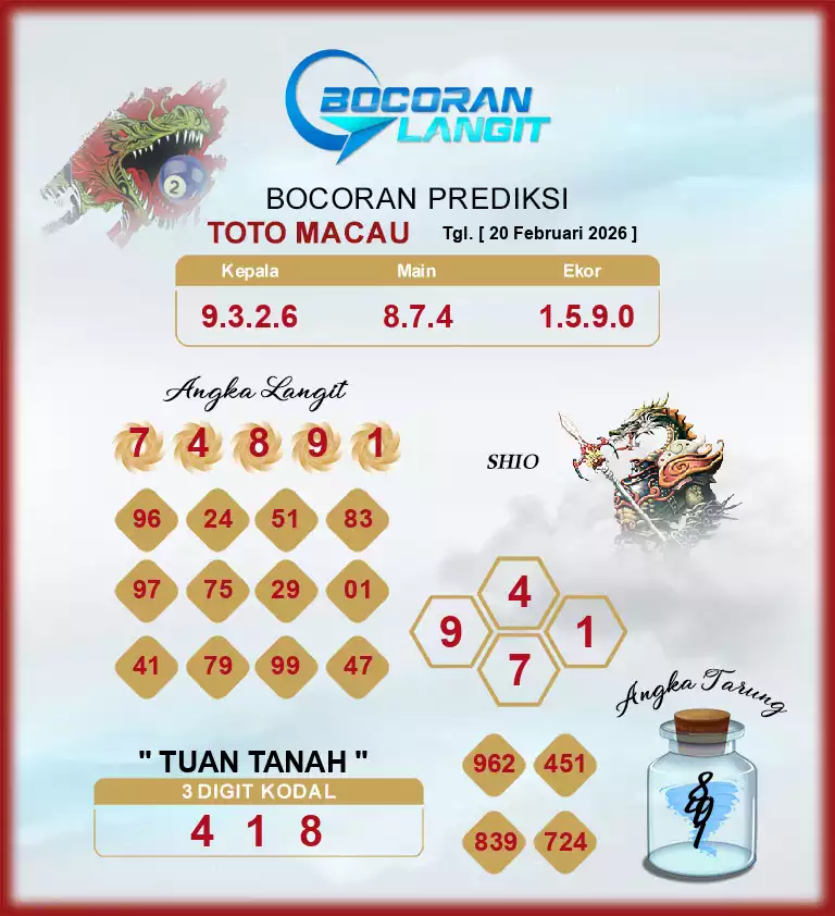 Syair togel Toto Macau adalah kode gambar yang dikeluarkan ke publik untuk menolong pemain judi togel supaya dapat semakin gampang untuk menang di menerka-nerka angka togel. Hal ini dikerjakan untuk dapat memperoleh kode syair togel karena itu pemain dapat segera membuka situs prediksi togel online yang telah disiapkan dengan fasilitas online. Situs Prediksi JOGJATOTO sendiri memiliki beberapa situs prediksi togel yang dibikin oleh beberapa master togel yang telah eksper yang mempunyai mimpi dapat menolong beberapa pencinta togel menang di beli nomor togel.